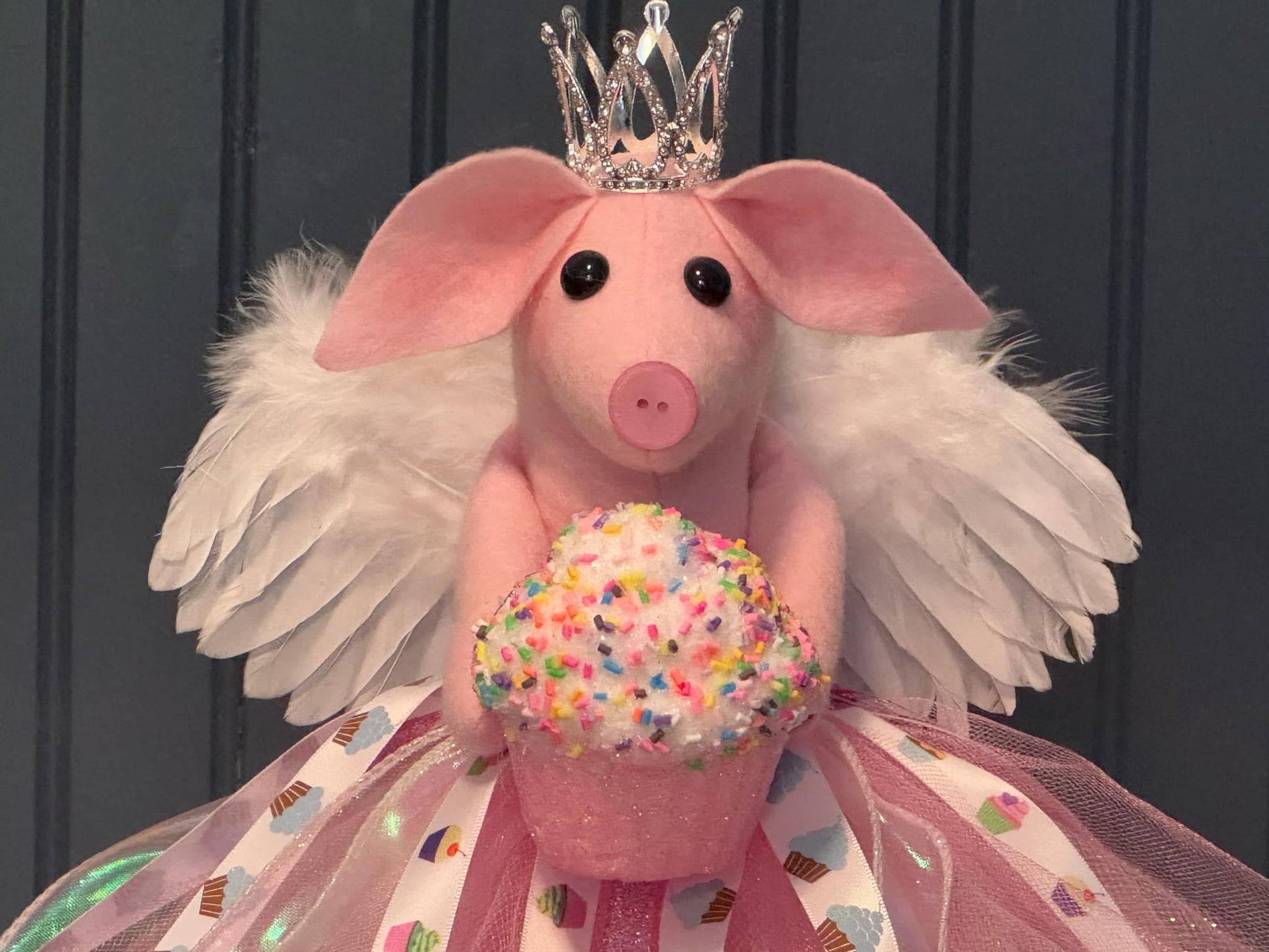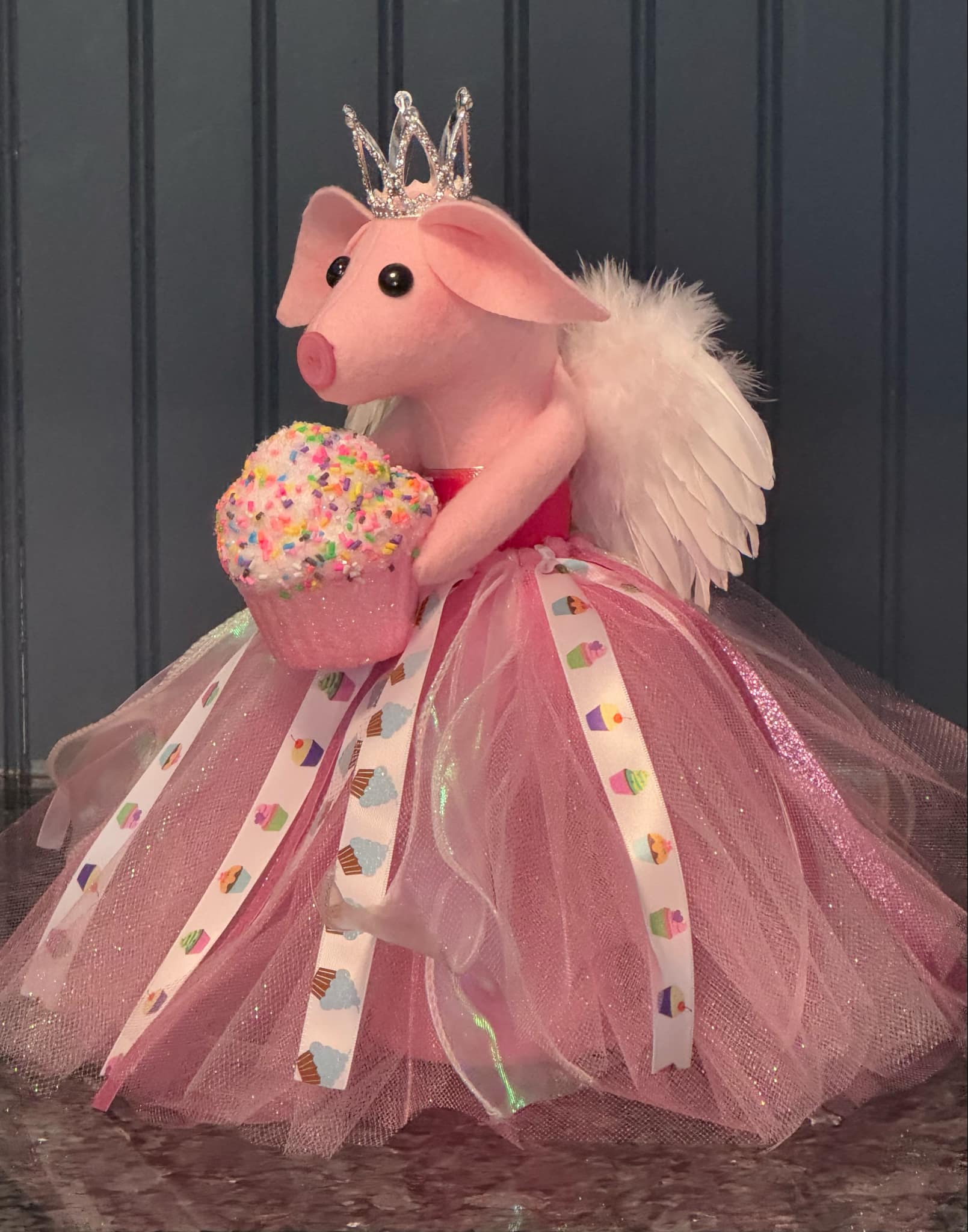 Angel Esther gave Chris Coleman permission to create one of her famous piggy table toppers in memory of our Queen. This fabulous creation absolutely caused Esther to *faint* when she saw the size of the cupcake! Start your own collection or add to an existing collection with this one-of-a-kind (at least for now) beautiful piggy with a gorgeous ballroom style dress, majestic crown and fluffy wings.