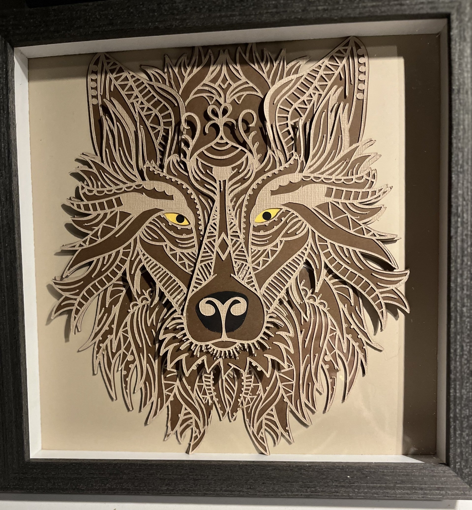 The artist uses layers of cardstock to create an interesting blending of color and dimension to create the 3D image framed in a shadow box. Handmade by donor. 8 inches x 8 inches