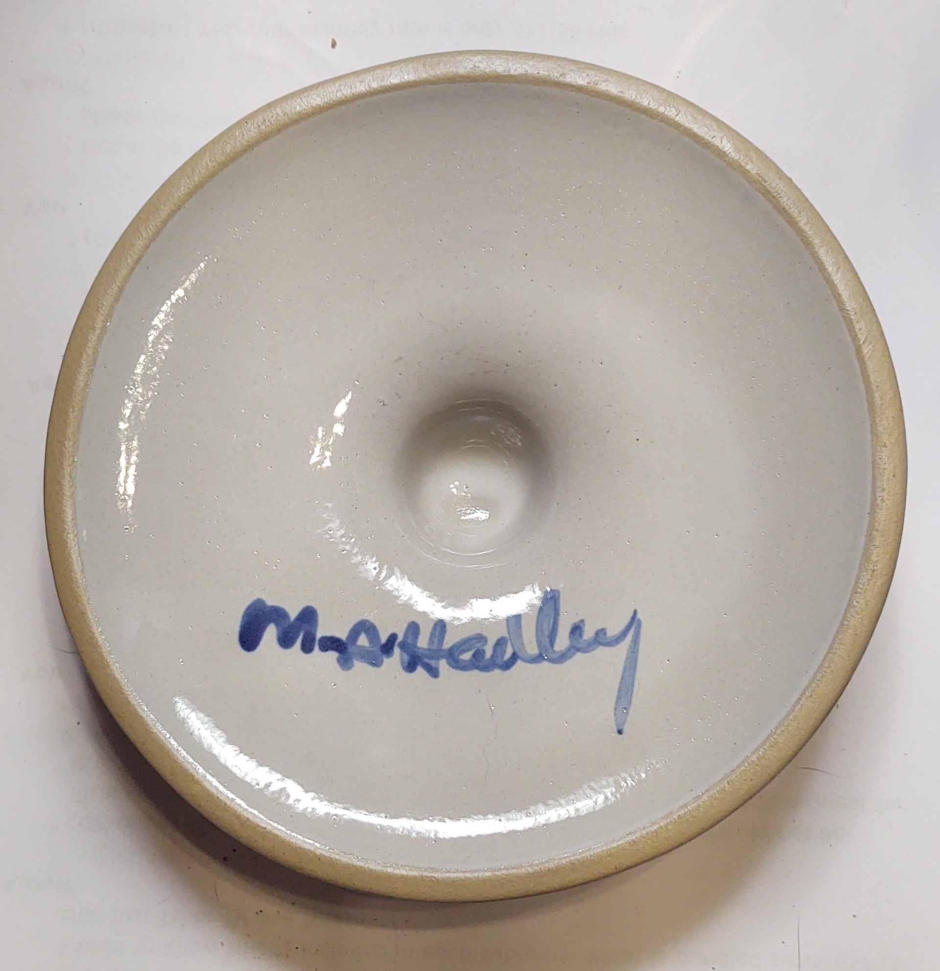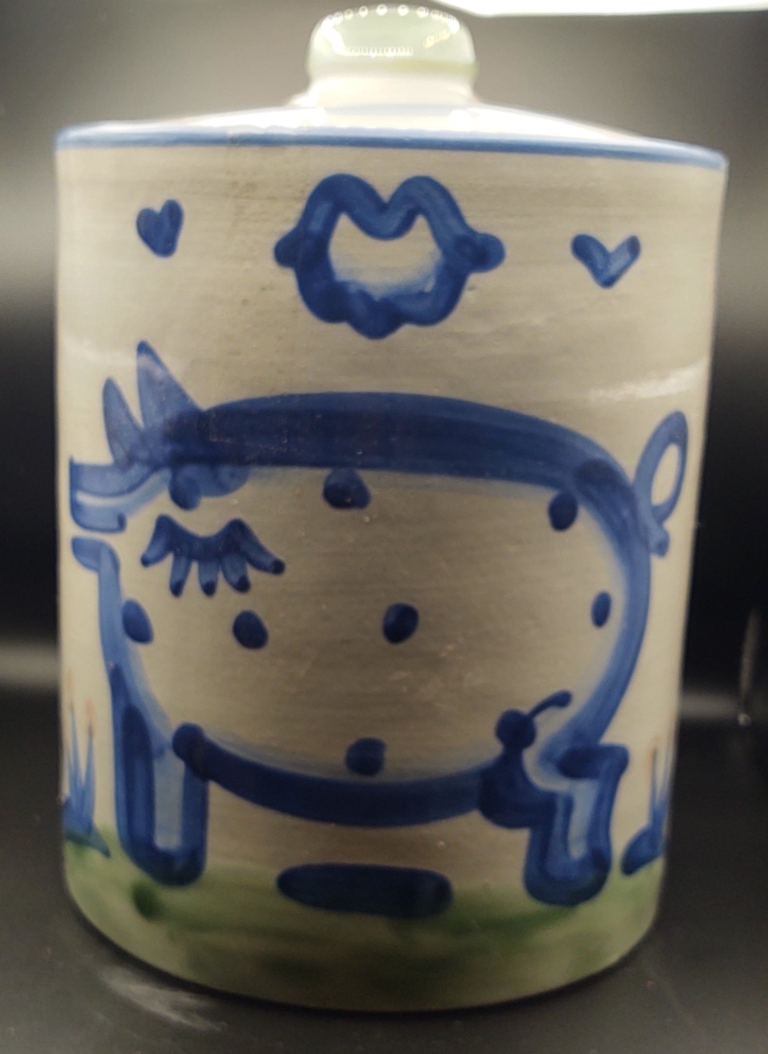 Extremely heavy M.A. Hadley Pig Canister with lid. Weighs 10 pounds. This is the perfect container for pig (or some other pet) treats. Signed on bottom of jar and inside lid. Marked with "The End" at the bottom of the canister. Made in Louisville, Kentucky. In excellent condition.
