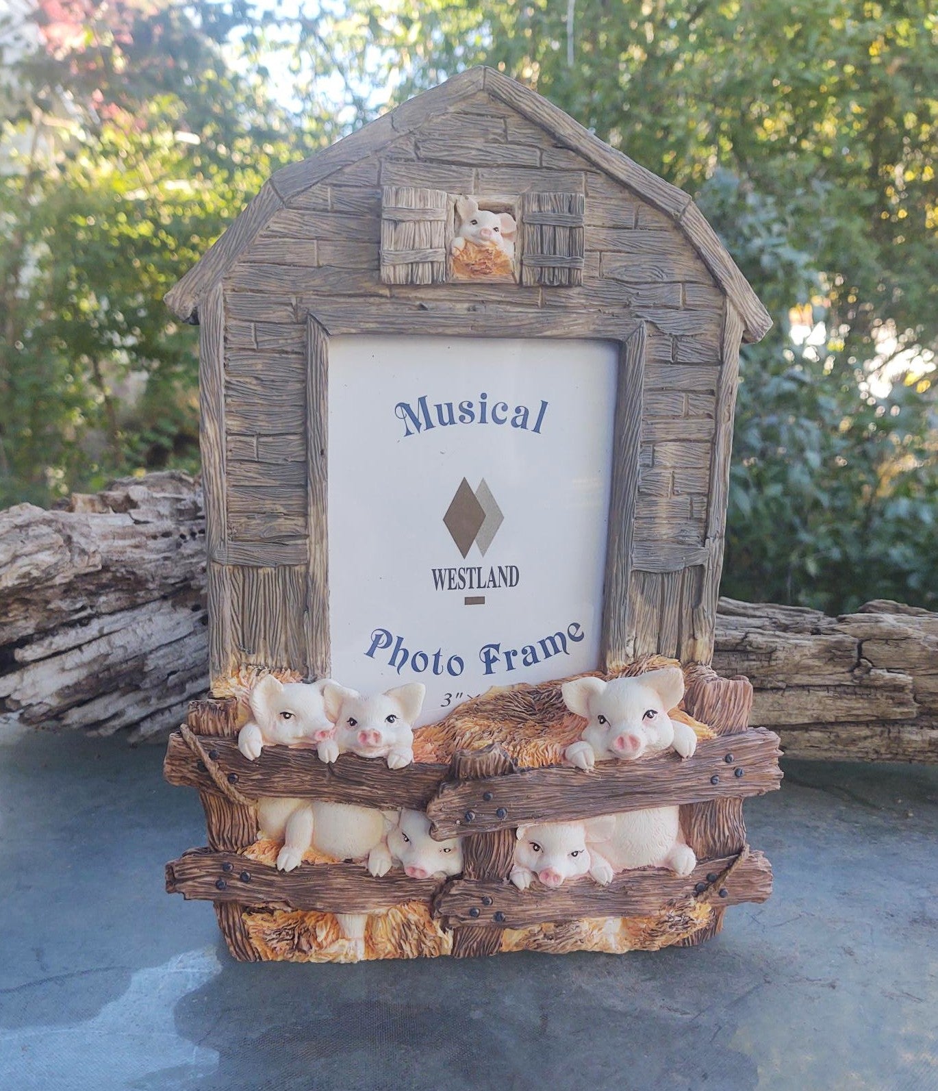 Wow! Look at all those piggies playing in the straw. When wound up this musical photo frame plays "Farmer in the Dell"! Holds a 5x7 photo. Frame measures 10 inches by 7 inches. Photo of Steve and Matt is just for showing a sample.