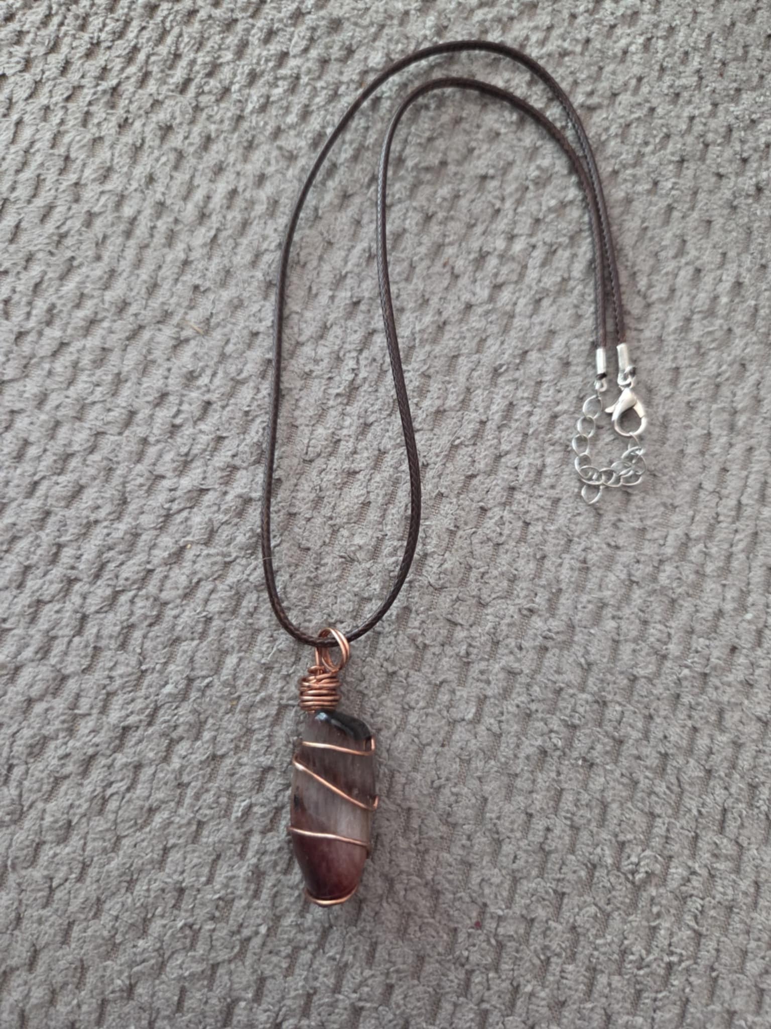 Handcrafted necklace with wire wrap agate pendant. Agates are often associated with grounding, stability and emotional balance. Pendant is about 1.5 inches long. Cord is about 17 inches long.