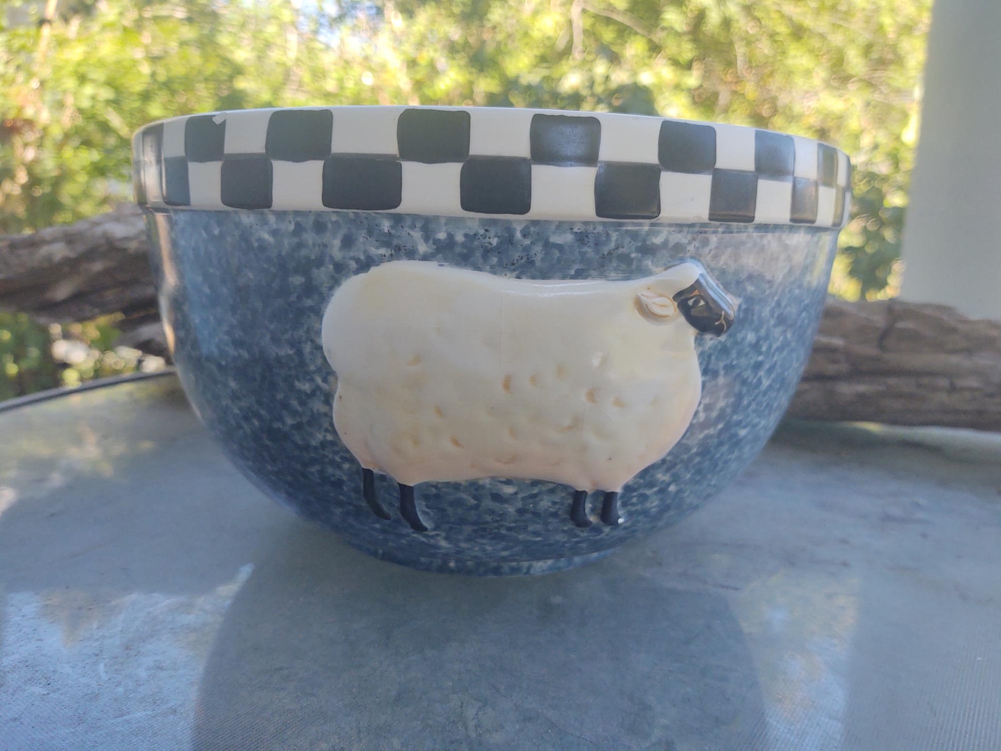 Previously owned nesting mixing bowls with farm animal artwork by Warren Kimble. Checkerboard edge. By Sakura for Oneida. Use the for their original purpose or for household decorating. There are some small chips and scratches but nothing that impacts the quality of the bowls.