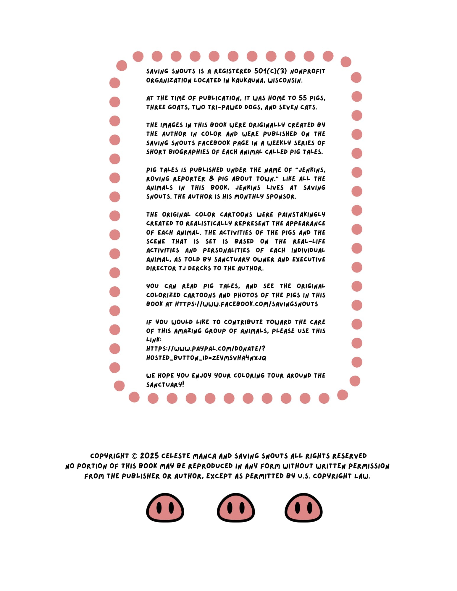 Saving snouts is the sanctuary in Wisconsin USA that is also the home of Steve's namesake Jenkins. Jenkins also has a virtual doppelganger who is the Roving Reporter and Pig About Town spokespig for Saving Snouts and our guest autioneer for this event. We have a few coloring books in the auction (more to be posted on the final weekend) and this one has some really cute drawings created by our own Celeste Angelia Manca.