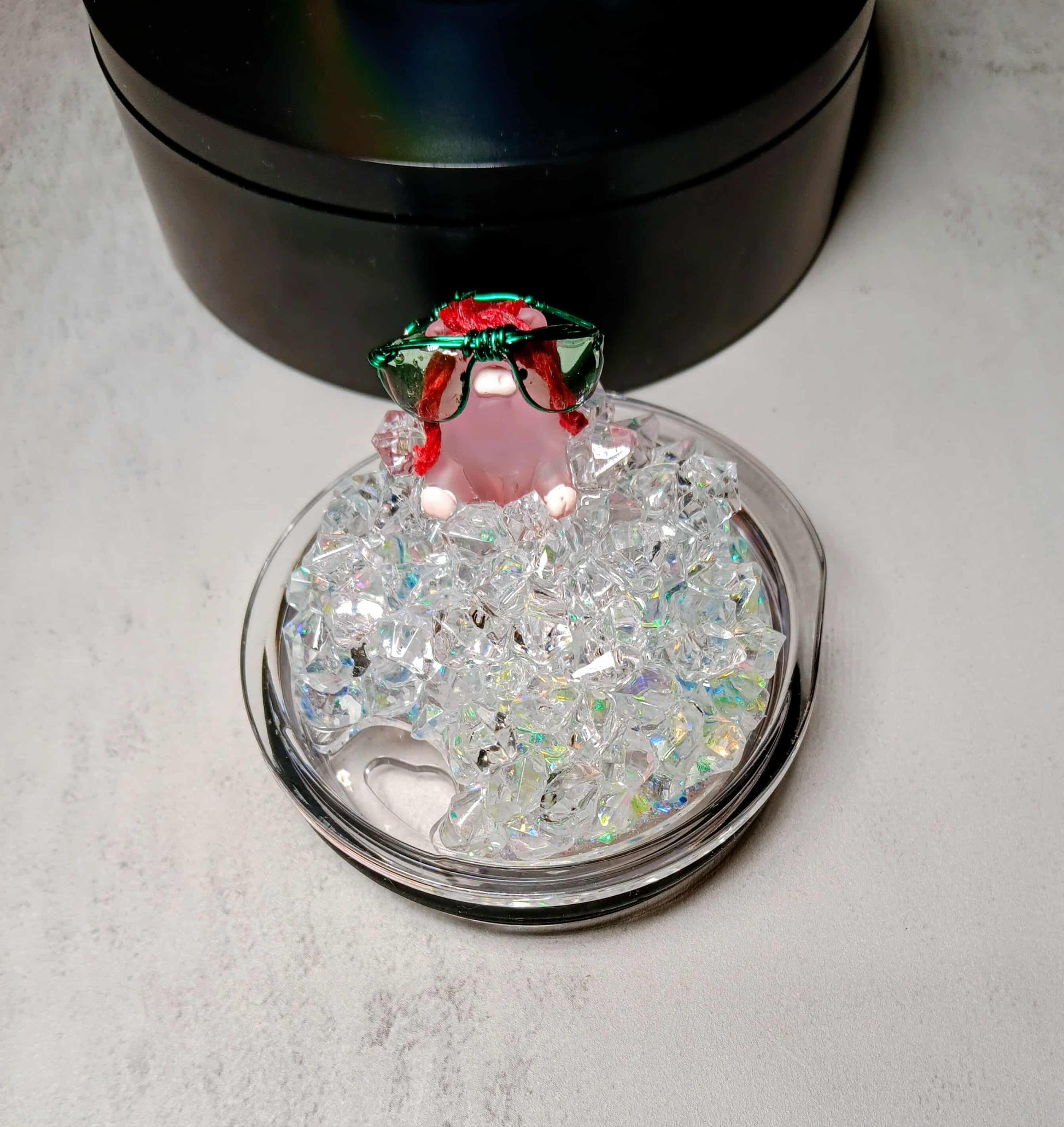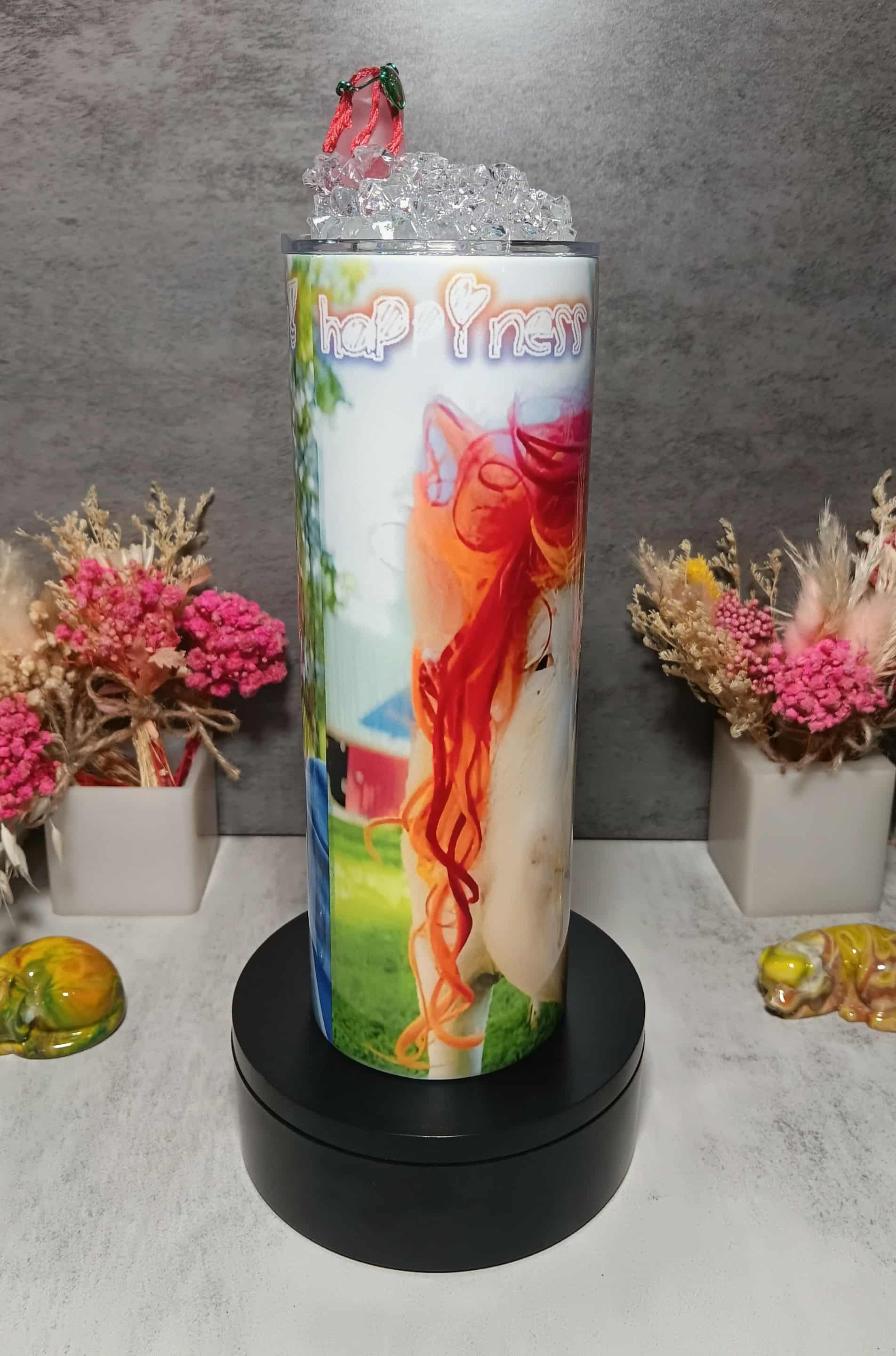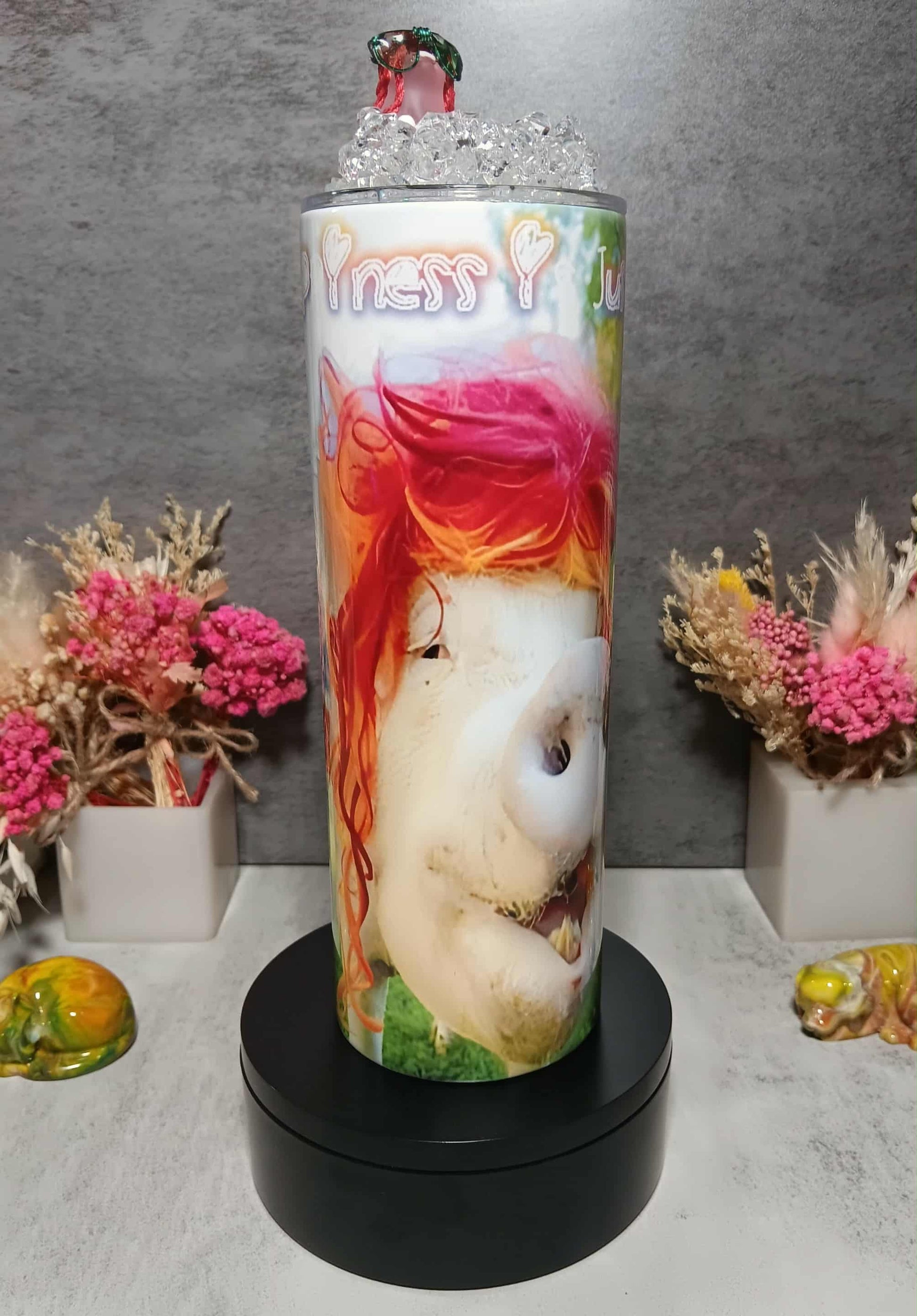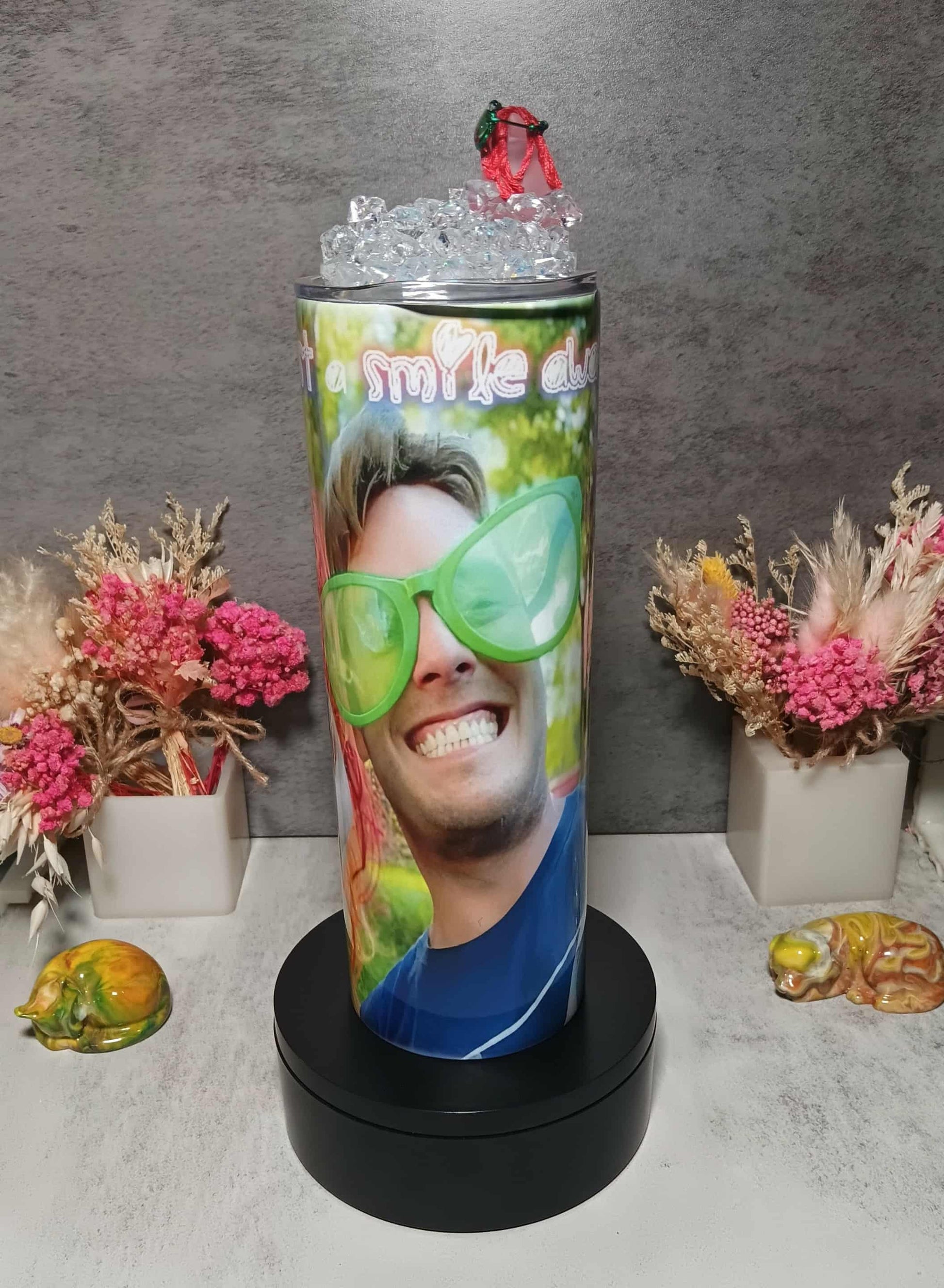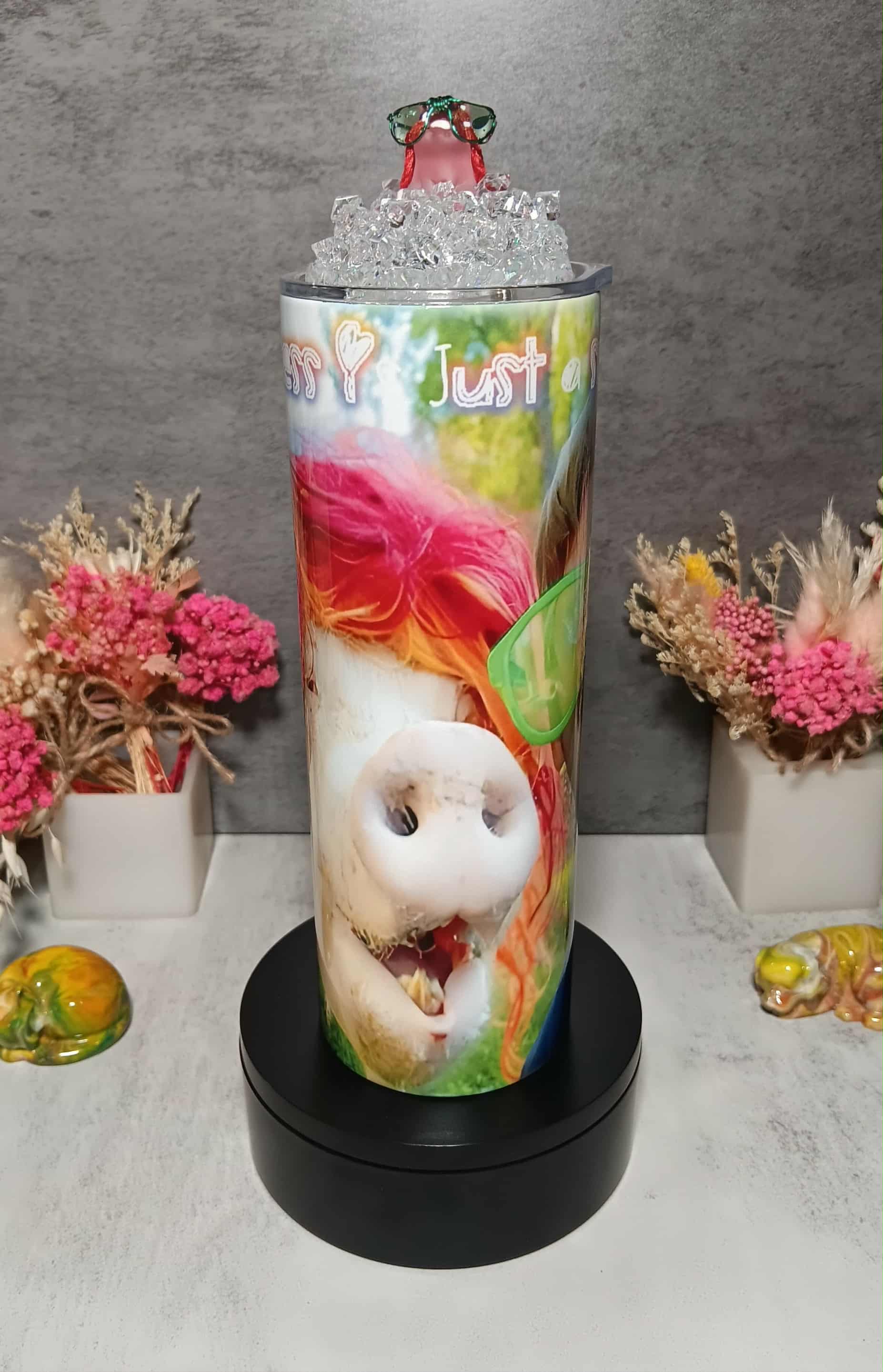 OMP! This 20 ounce tumbler features one of our favorite photos of Steve and Esther. Esther is dressed in her finest attire and Steve, well, you know! The first photo shows a mock-up of the tumbler. Then there are successive photos showing views as the tumbler is turned. The glow-in-the-dark lid features a pig wearing green glasses and sitting in ice. Hmmmm, there is a resemblance to Esther! The saying on the tumbler reads "Happiness is just a smile away!"